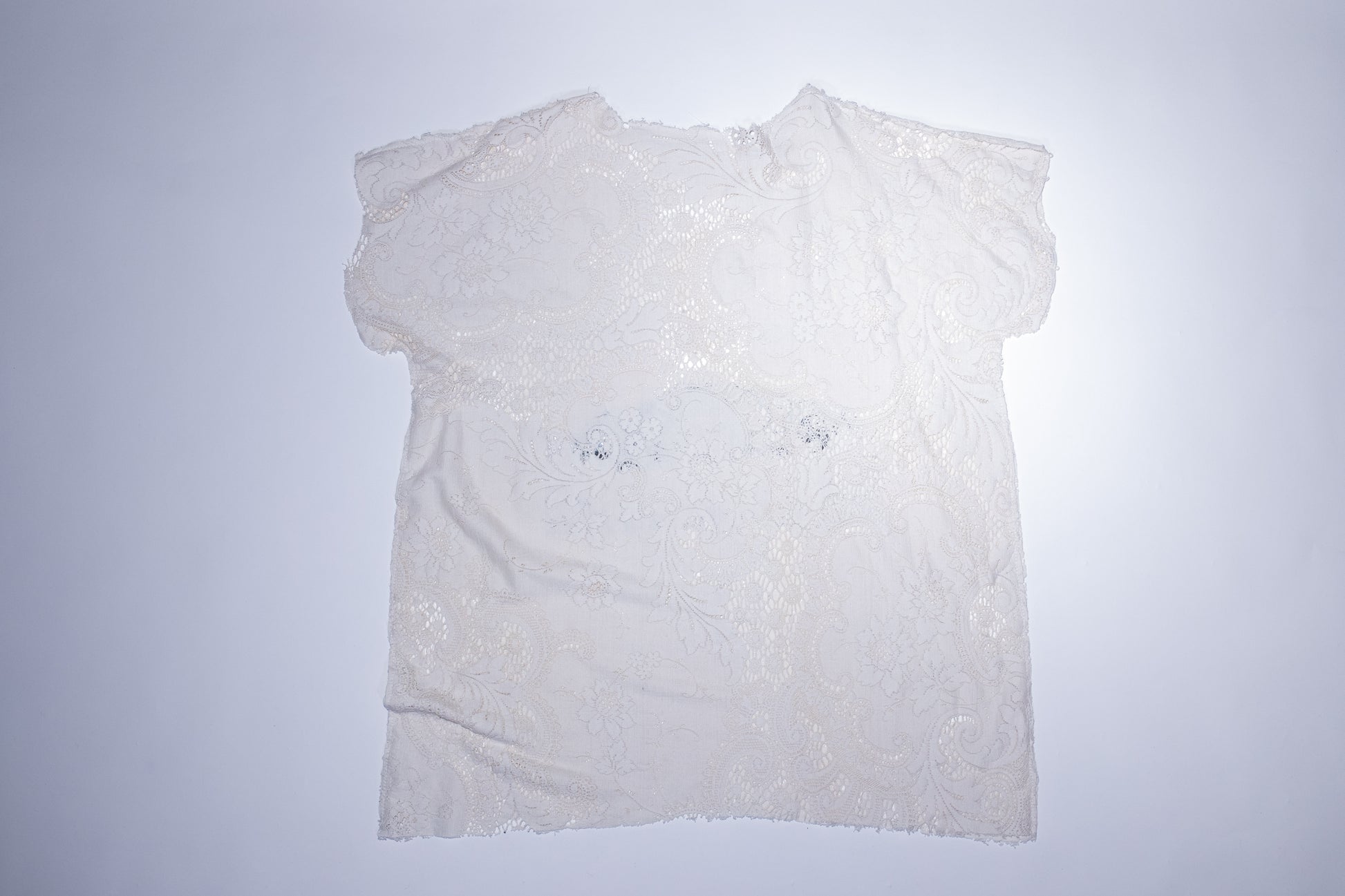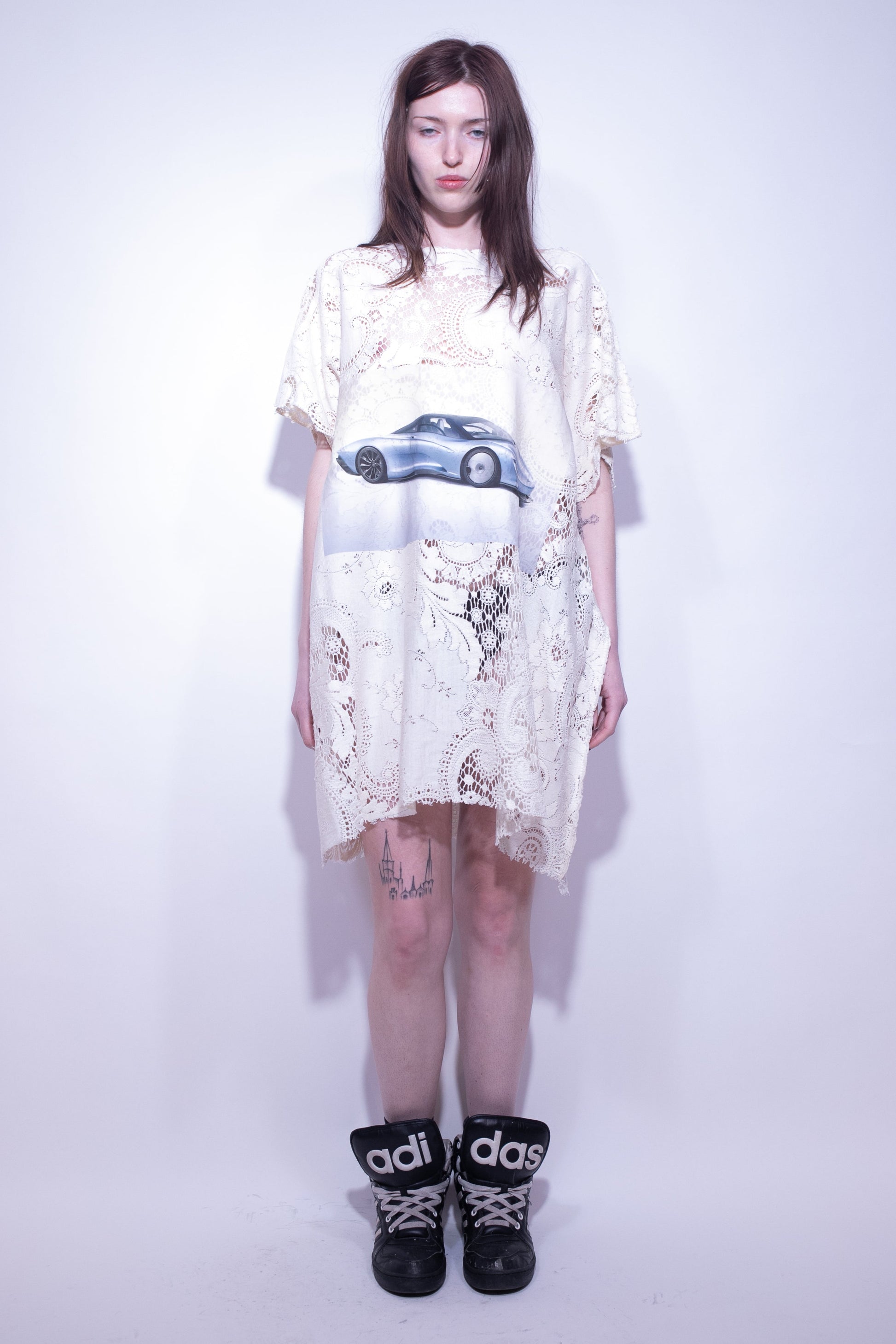 details: vintage lace, oversize fit, flat construction, short sleeves, raw edges, front print