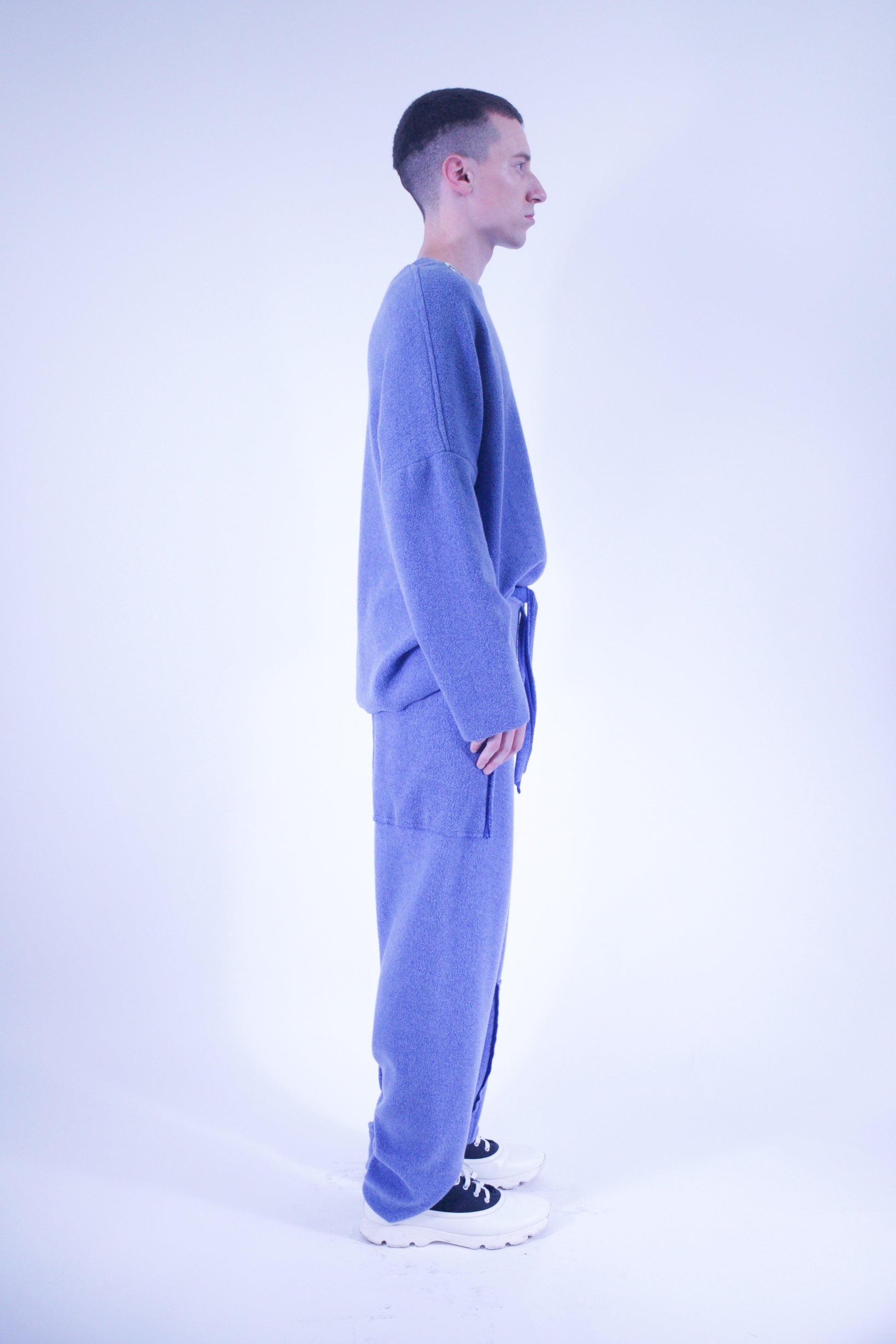 Cotton fleece pants with adjustable belted waist, raw edges and big pocket. Logo detail.