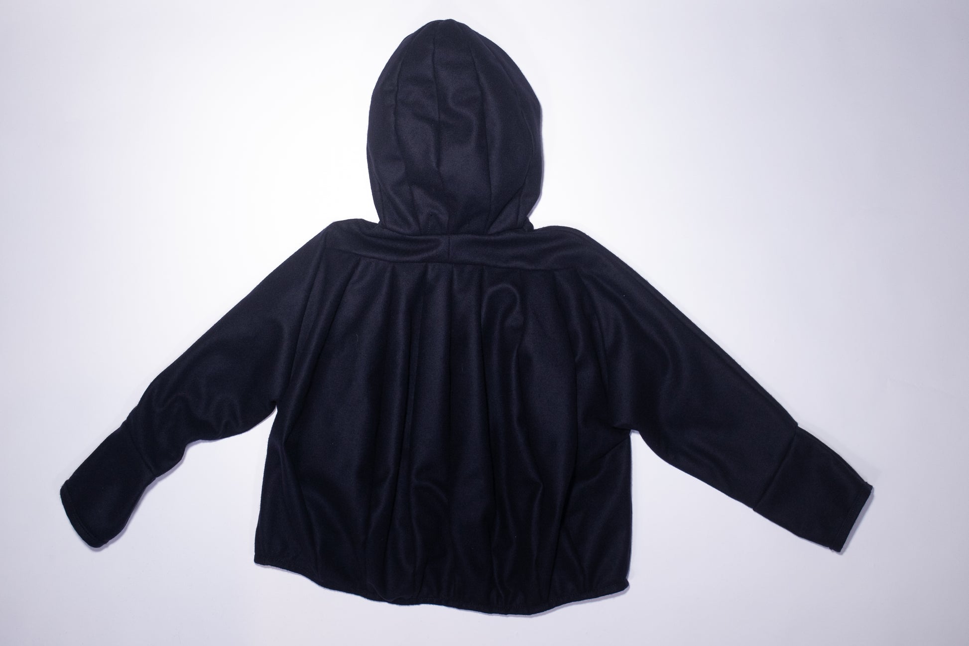 details: long multipanel elliptical construction, cinch hood, shoulder panel, drop shoulder, exterior label