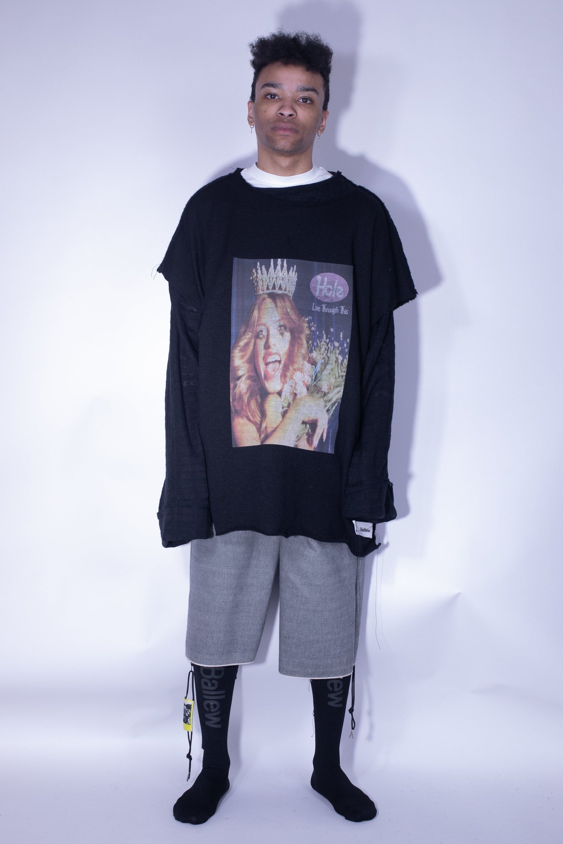 details: oversized, raw seams + hems, loose threads, courtney love front print, exterior labeling