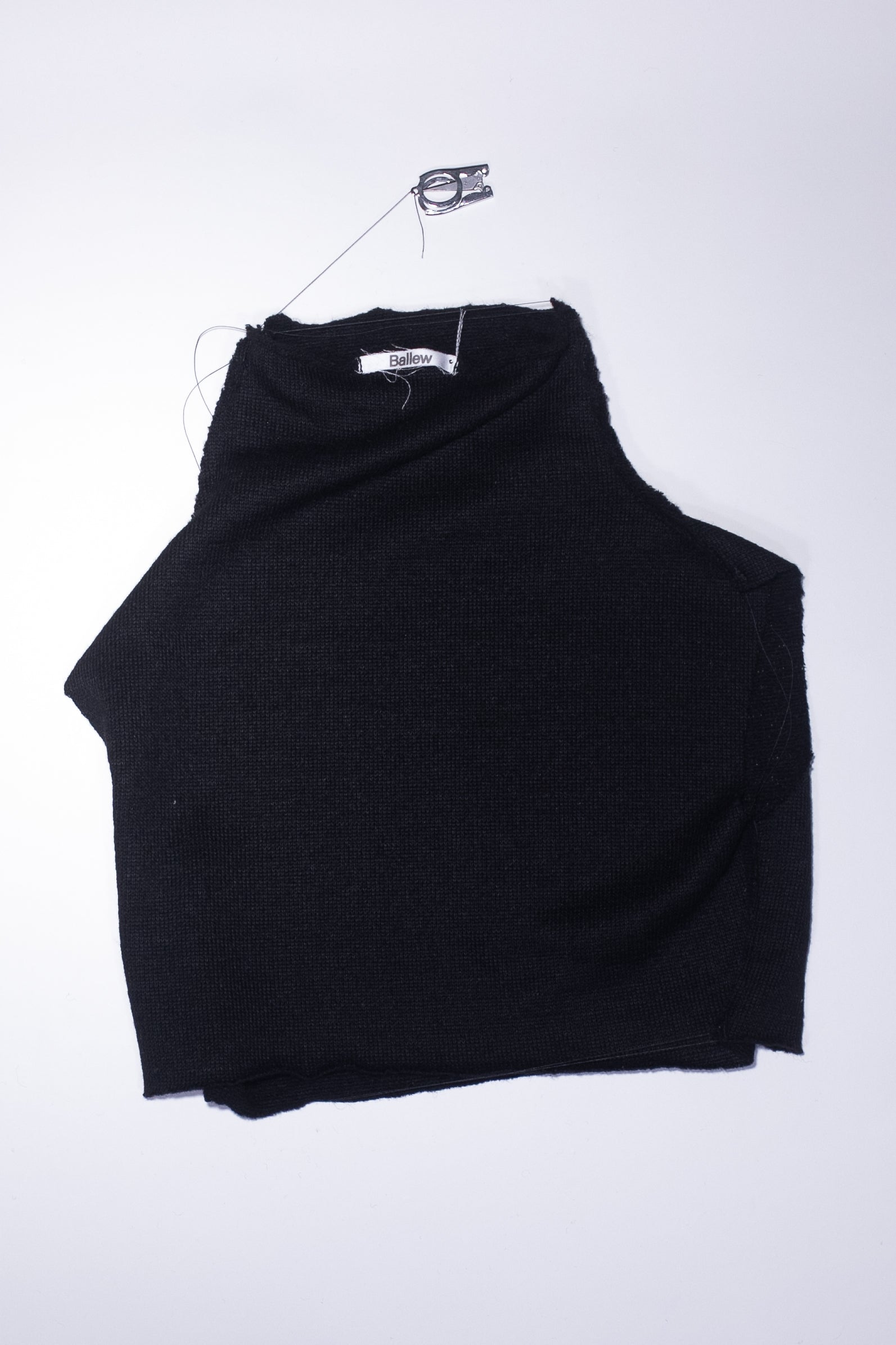 details: turtleneck, cropped fit, raw seams + edges, loose threads, comes with folding scissors