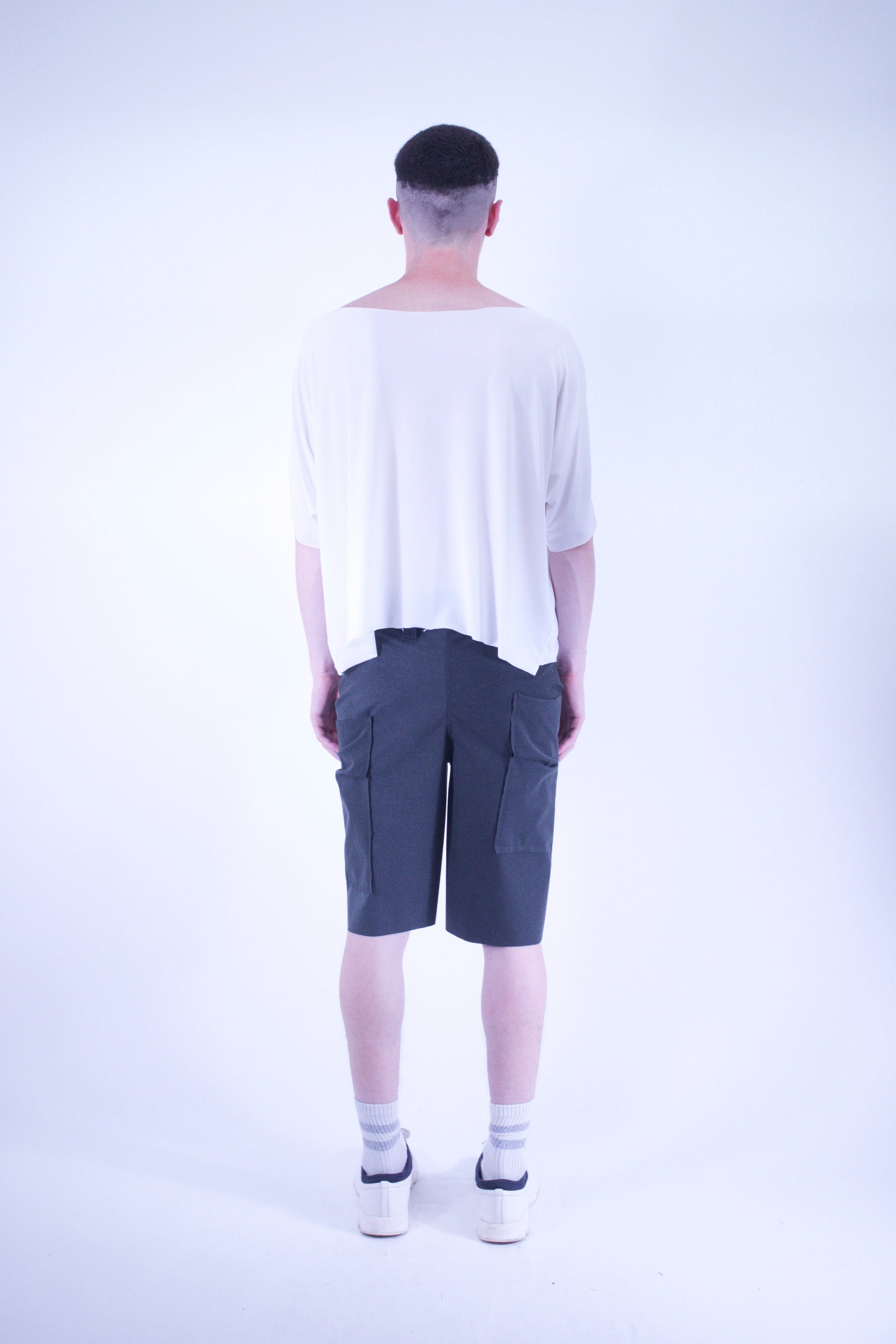 Cargo shorts in a dark green ultra suede with pinched pockets.