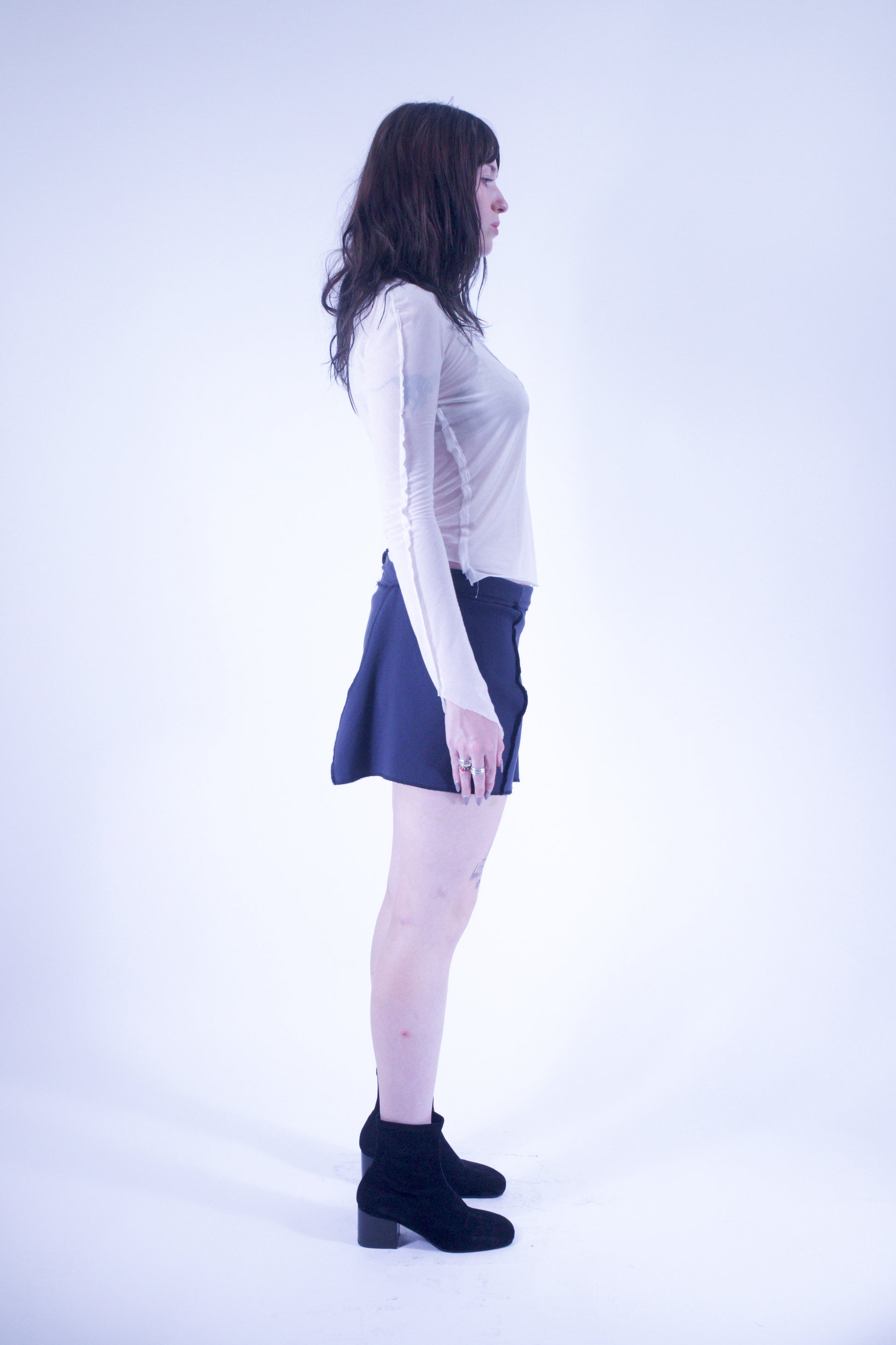 Technical poly tennis skirt with adjustable waist and asymmetrical cut. Raw distressed edges.