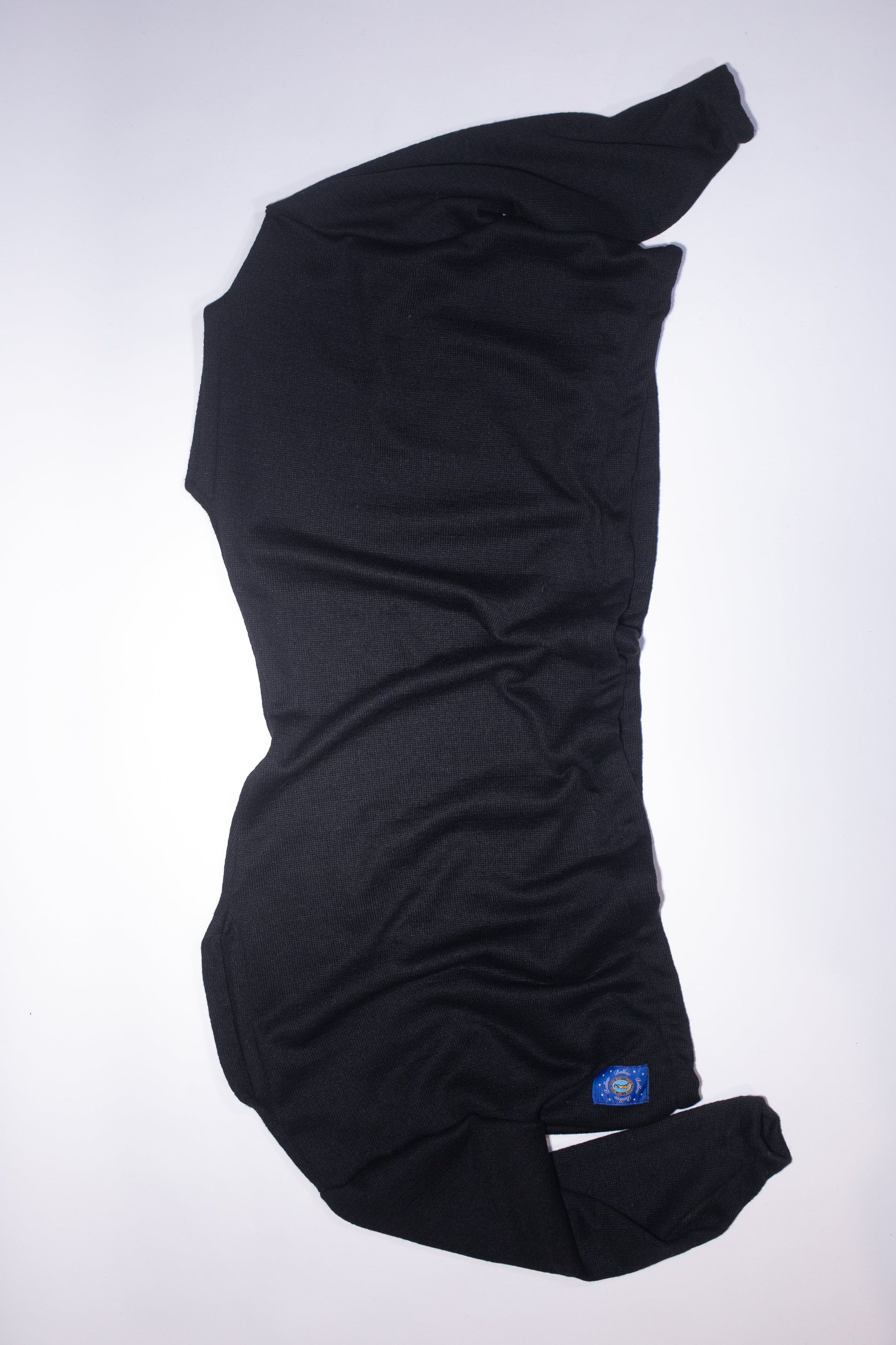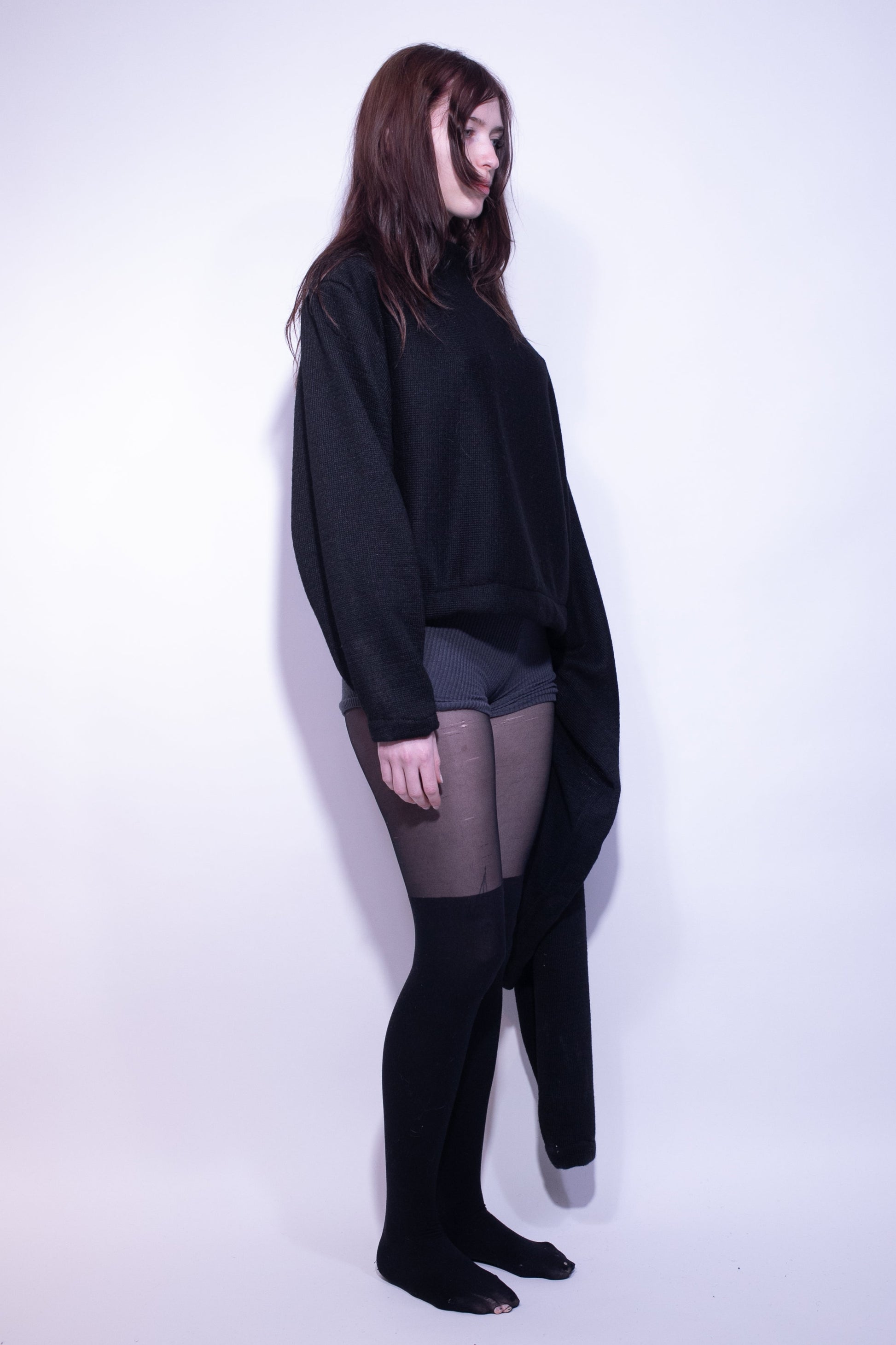 details: sweater for two, mock neck. when worn by one person, arm goes through opposite neck hole.