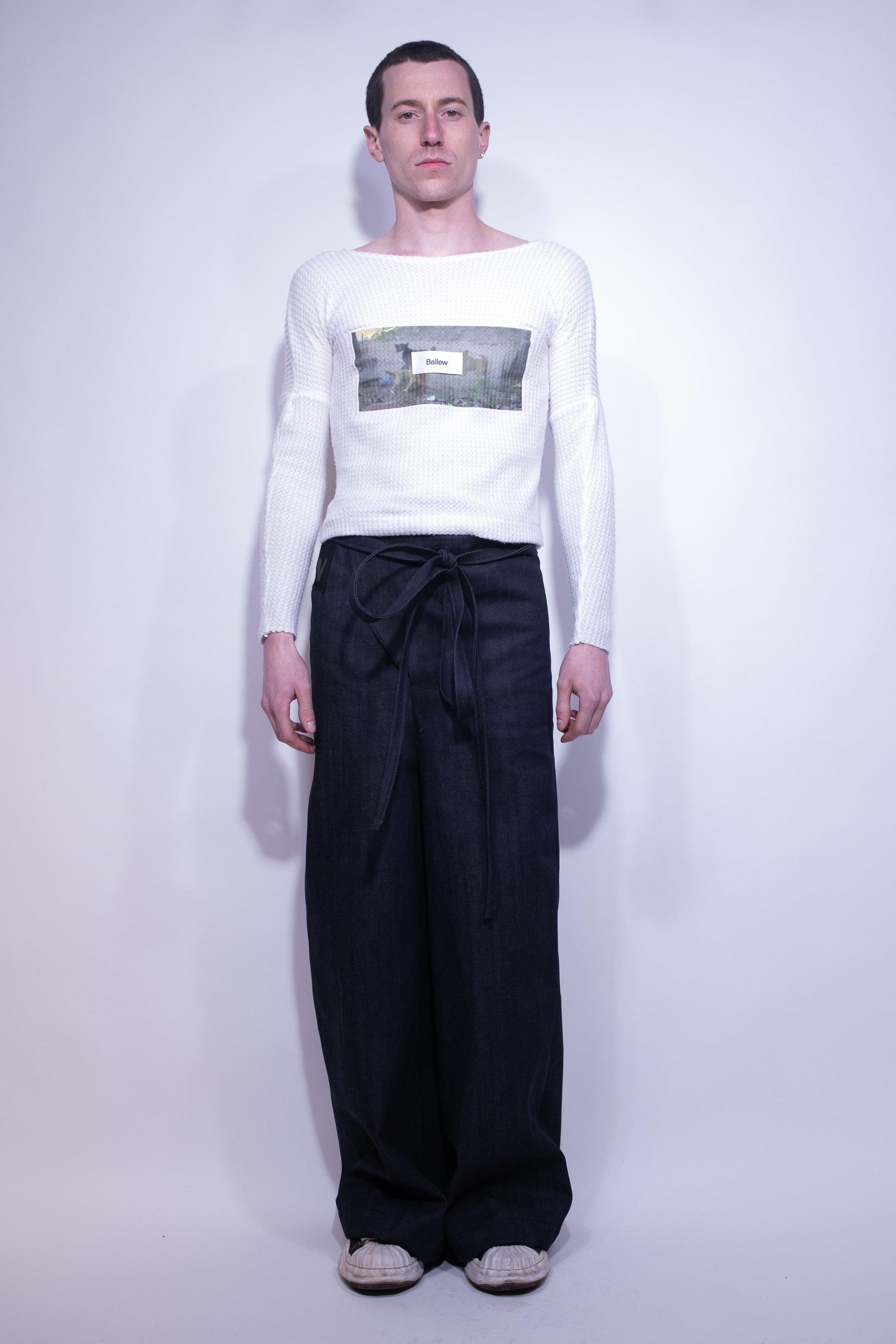 details: wide cut, wrap closure, exterior label, extra long waist tie