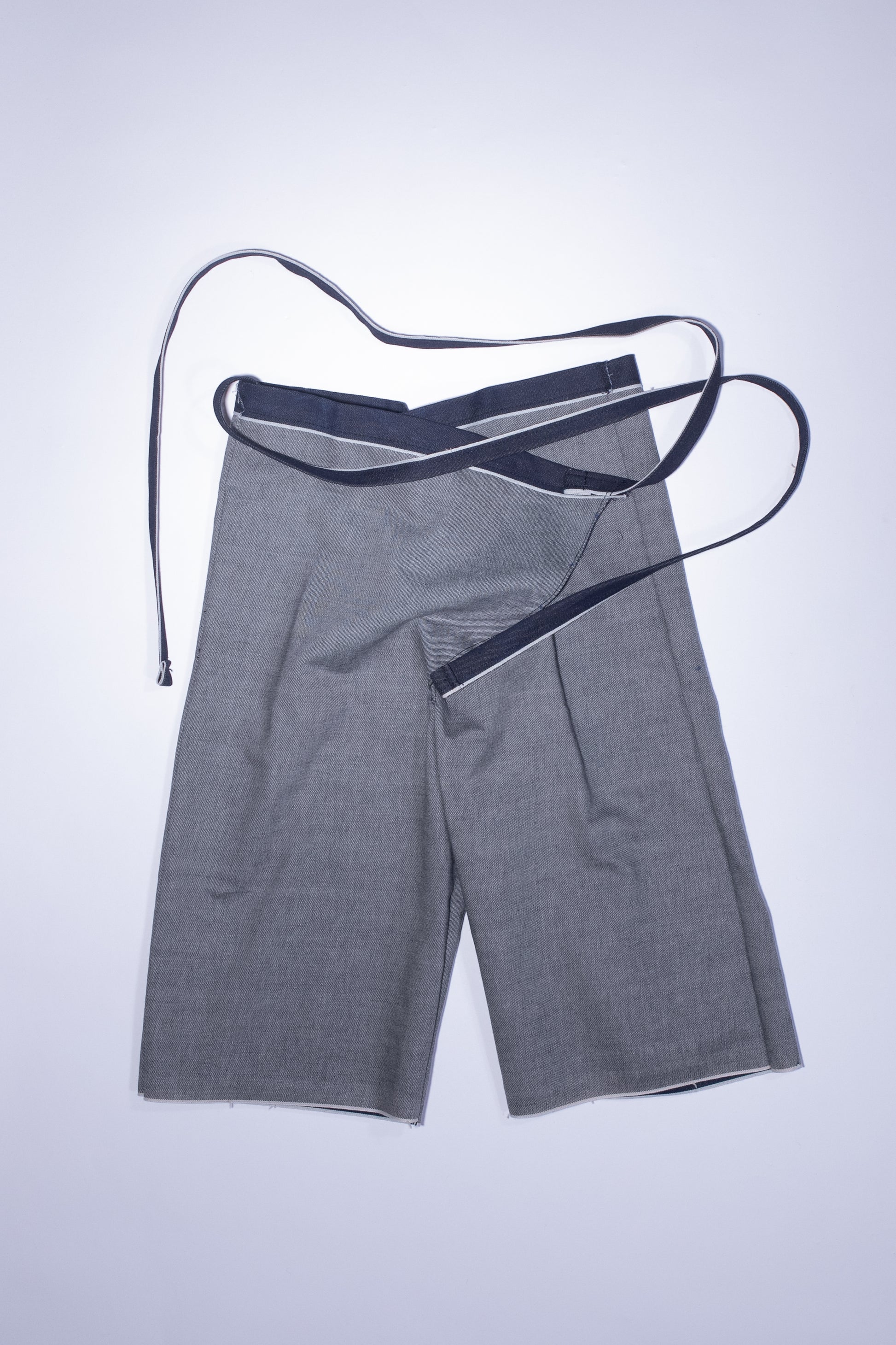 details: long shorts, wrap closure, reversed denim, selvedge to selvedge, extra long waist tie, exterior label